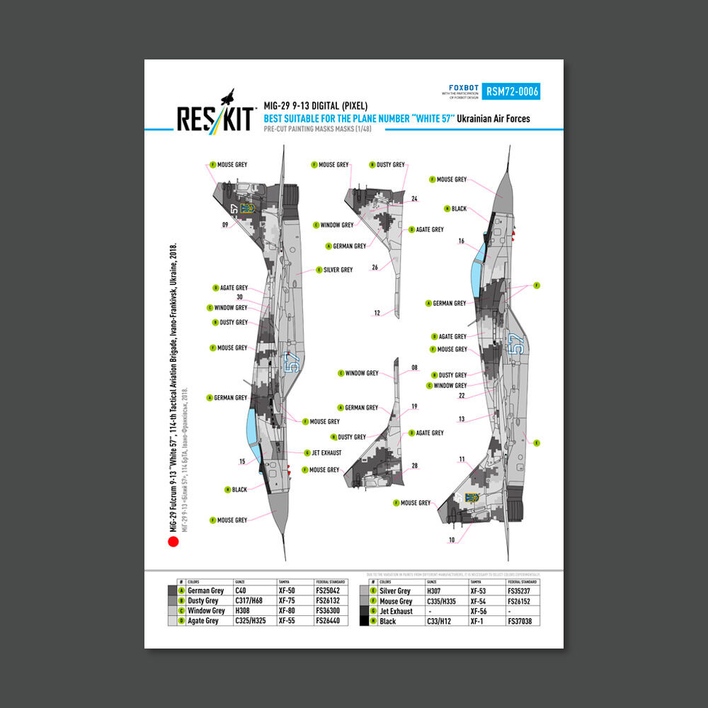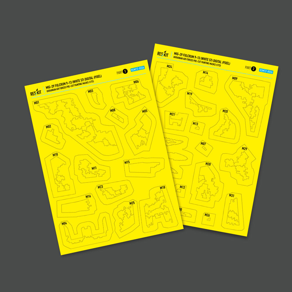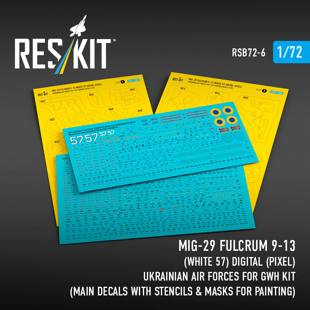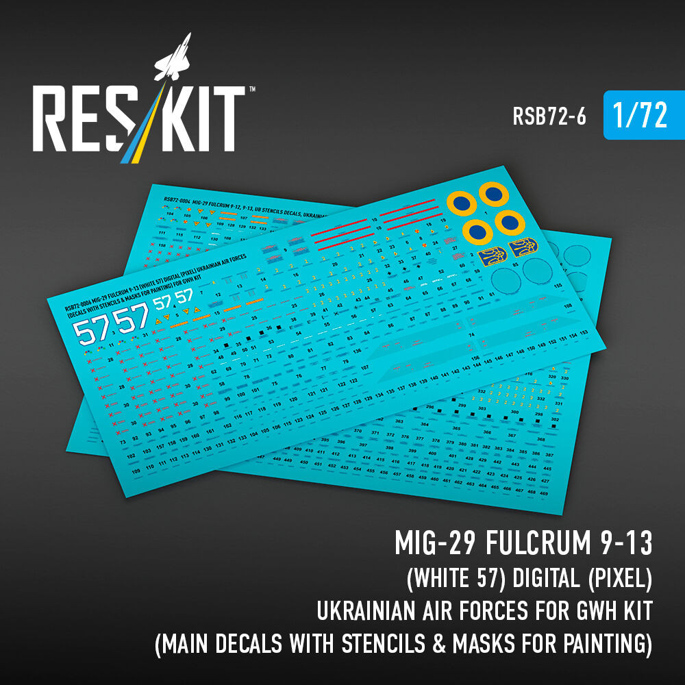 ResKit Models MiG-29 Fulcrum 9-13 (White 57) Digital (Pixel) Ukrainian Air Forces for GWH kit (Main Decals with Stencils & Masks for painting) 1:72 (RSB72-0006) ResKit Models MiG-29 Fulcrum 9-13 (White 57) Digital (Pixel) Ukrainian Air Forces for GWH kit (Main Decals with Stencils & Masks for painting) 1:72 (RSB72-0006) ResKit Models MiG-29 Fulcrum 9-13 (White 57) Digital (Pixel) Ukrainian Air Forces for GWH kit (Main Decals with Stencils & Masks for painting) 1:72 (RSB72-0006) ResKit Models MiG-29 Fulcrum 9-13 (White 57) Digital (Pixel) Ukrainian Air Forces for GWH kit (Main Decals with Stencils & Masks for painting) 1:72 (RSB72-0006)
