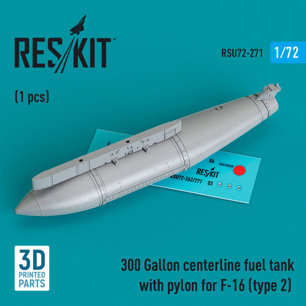 ResKit Models 300 Gallon centerline fuel tank with pylon for F-16 (A/B/C/D/E/F/I) (type 2) (1 pcs) (3D Printed) 1:72 (RSU72-0271)